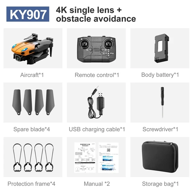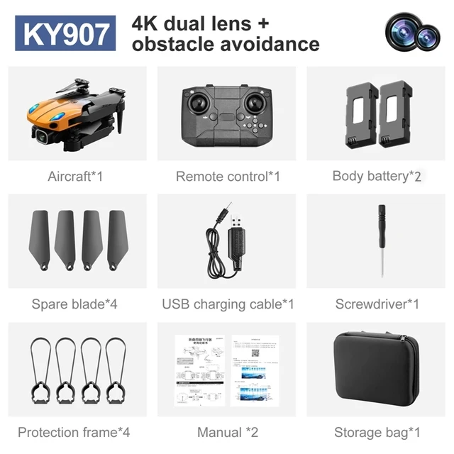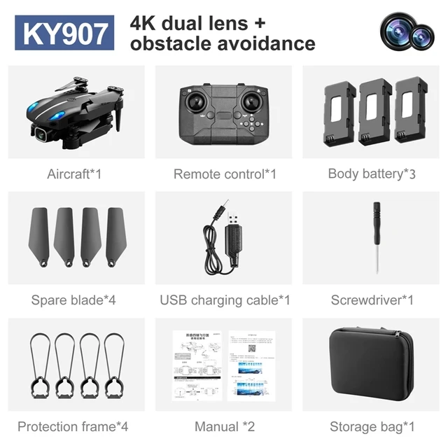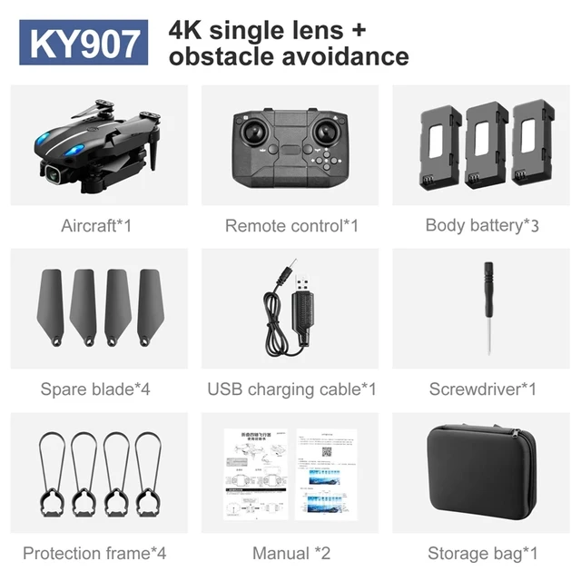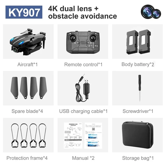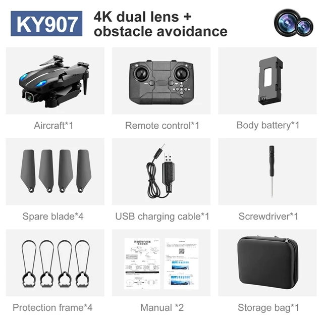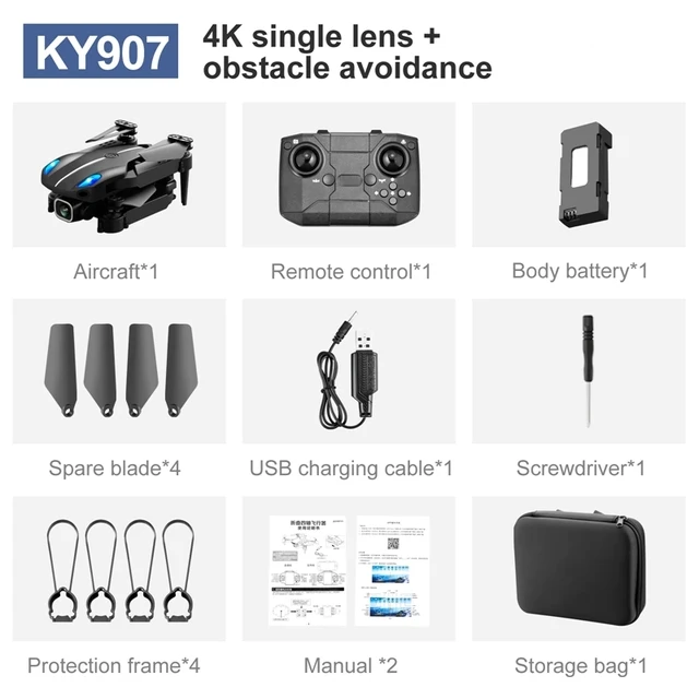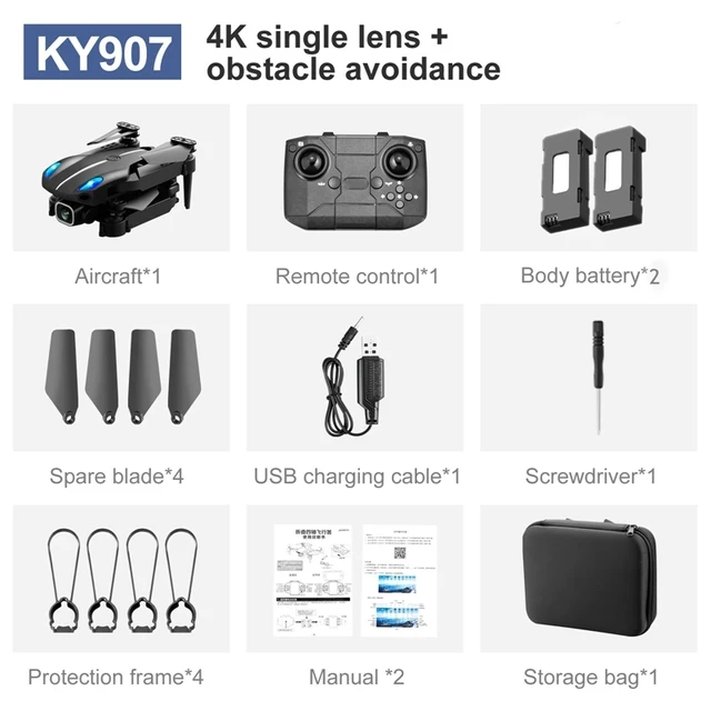 Description:<;;br/>Item Name: KY907<;;br/>Channel: 4 Channel<;;br/>Gyro: 6 Axis <;;br/>Camera: 4K<;;br/>Camera Wide Angle:120°<;;br/>Flight Time: about 15mins<;;br/>Charging time: About 3 hours<;;br/>Max Size of phone supporting: 5.5inch<;;br/>Drone Battery: 3.7V 800mAh Battery<;;br/>Remote Distance:150m<;;br/>Functions:<;;br/>1. The drone has its own obstacle avoidance function to automatically avoid obstacles<;;br/>2. One-key take-off/ one-key landing/ 360° roll/headless mode/fast/slow gear/photograph/video/switch dual camera/face recognition automatic photo/gravity sensor/track flight/<;;br/>Drone Size:<;;br/>17x16x4.5cm(Expanding)<;;br/>6x9x4.5cmcm(Folded)<;;br/>Package Included:<;;br/>1 x KY907 RC Quadcopter<;;br/>1 x Remote Controller<;;br/>1 x 3.7V 800mAh Battery<;;br/>1 x USB Charging Cable<;;br/>4 x Spare Blade<;;br/>1 x User Manual<;;br/>1 x Screwdriver<;;br/>squid game pop it pokemon anime naruto halloween fidget toys stickers christmas juego del calamar hello kitty one piece paw patrol brinquedos juguetes para niños kawaii minecraft toys montessori marvel tokyo revengers genshin impact hot wheels popit demon slayer squid game costume stitch funko pop lego technic baby spiderman anime figure squidgame bebe pokemon cards el juego del calamar lol free shipping items bebe reborn among us dragon ball action figure 18 fortnite<;;br/>squid game anime christmas juguetes para niños stickers fidget toys lego technic toys navidad kawaii montessori stitch tokyo revengers baby funko pop demon slayer spiderman halloween juguetes lego star wars anime figure popit<;br/>anime spiderman stickers lalafanfan squid game kawaii lego technic demon slayer funko pop genshin impact anime figure fidget toys toys juguetes para niños kuromi tokyo revengers baby lego star wars stitch cartas pokemon 30 lalafanfan huggy wuggy action figure free shipping items dron pokemon cards montessori bebe reborn drone 4k profesional